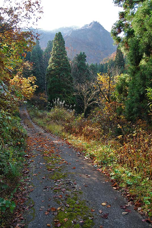 沢沿いの林道、奥に見えるのが山頂。車の乗り入れはできないので、車は駐車場に置いて徒歩。