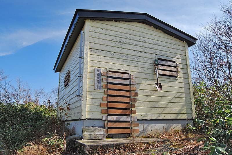 山頂から東側へ少し下ったところにある非難小屋。雪囲いをはずすのが面倒だったので 中には入らなかった。